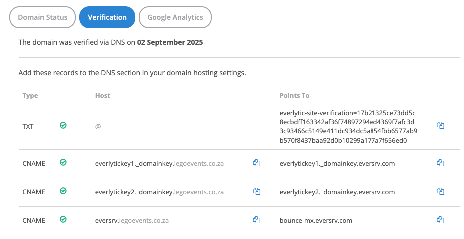 - Then click on verification, and you will see a pop up with a list of DNS records to add to the domains DNS - this becomes tricky if we do not host the domain that the mailer will be sent from - if not then the records need to be supplie to client so that they can have them added - THE MAILER CANNOT BE SENT OF THIS RECORDS ARE NOT ADDED
