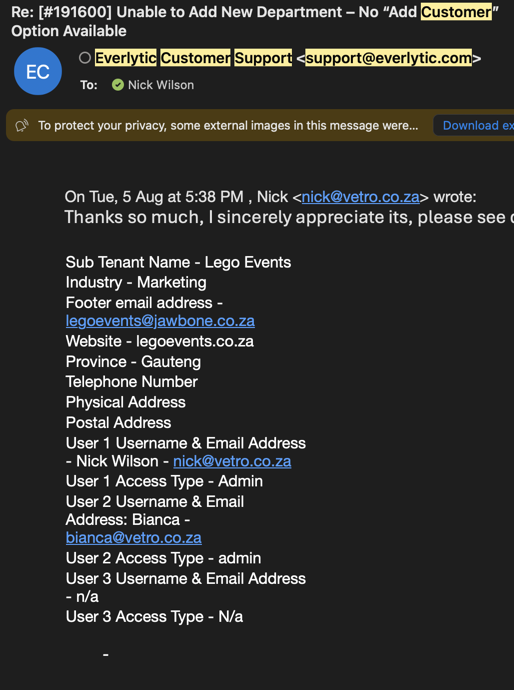 - Initially you will need to send mail to support@everlytic.com and request from them to create a new tenant for a new client as you wish to send a new campaign.