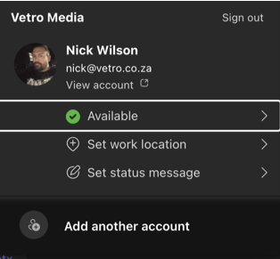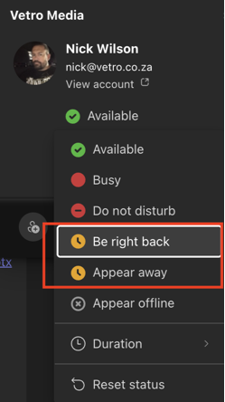 - Always ensure your Teams status Badge is set to Available during working hours - see example below: